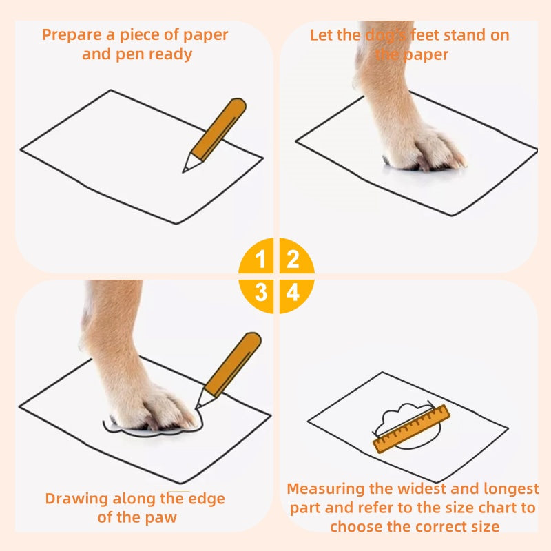 SIZE SELECTION: To measure correctly, have your dog stand on paper, draw lines around the paw, and measure the widest part. For comfort, choose a size slightly wider than the exact paw measurement.