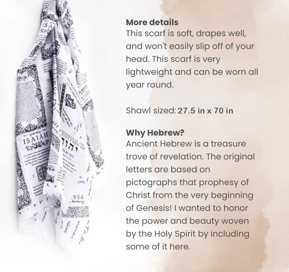 Adorned with scripture, this scarf is a declaration of God's constant love and care, with Jesus's name, "Yeshua," in Hebrew, affirming His role as our protector throughout. Featuring seven favorite scriptures, including Psalm 23 and Psalm 91, it offers spiritual comfort and protection to those who seek solace in God's word.