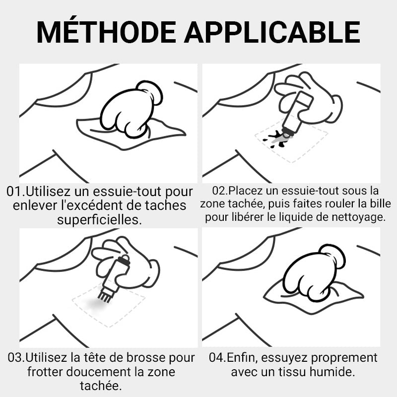 🧻 Step 1: Pat excess stain with a paper towel. 🎯 Step 2: Roll the evenly distributed ball over the stain to release the cleaning solution. 🖌️ Step 3: Gently scrub with the curved brush head. 💦 Step 4: Wipe clean with a damp towel – stain gone!