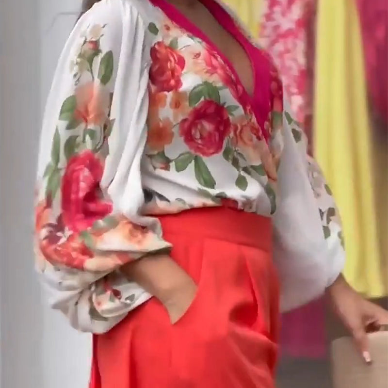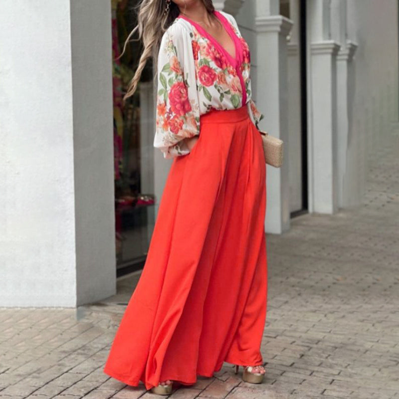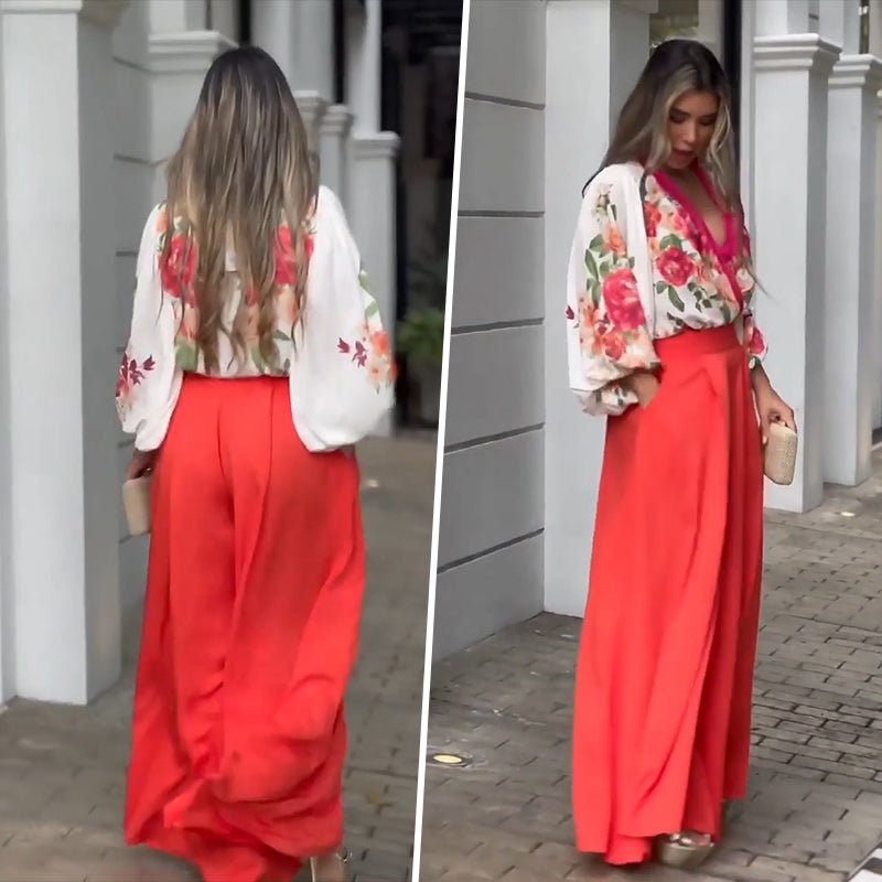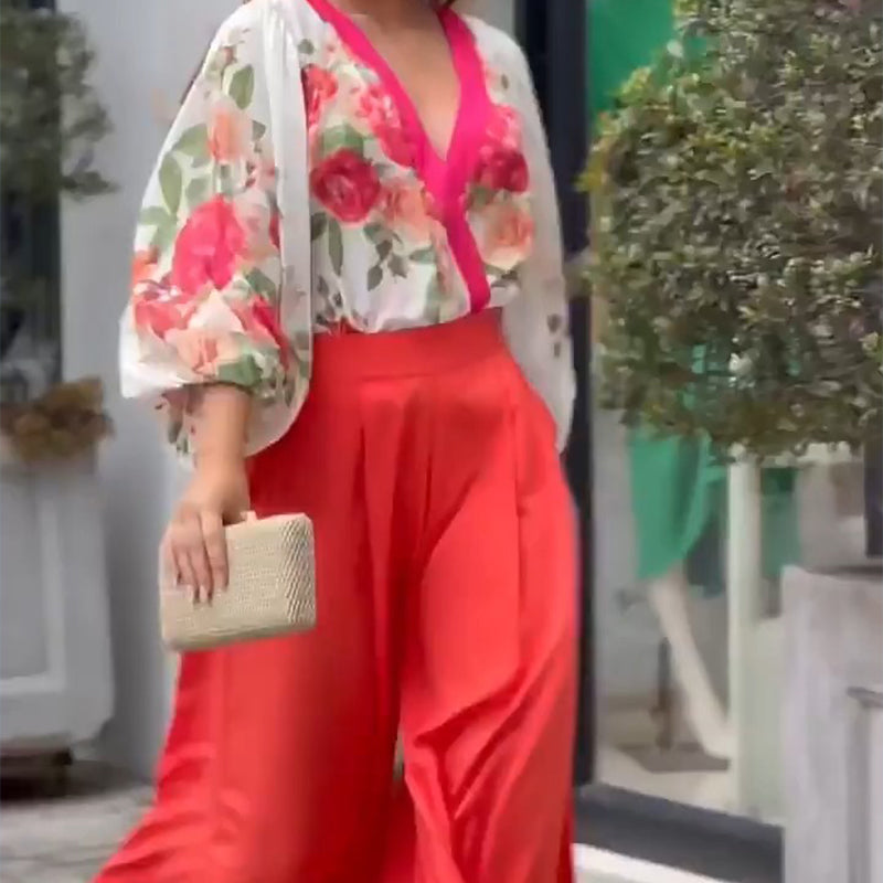 Romantic Rose Deep V-Neck Bubble Sleeves Top & Wide-Leg Pants Set