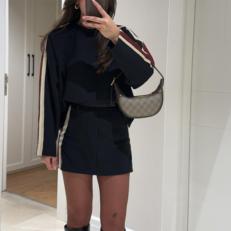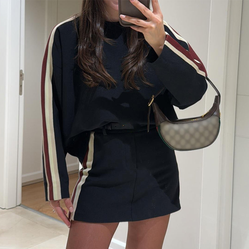 CHIC STRIPED ACCENTS - Both the top and skirt are enhanced with stylish striped accents, providing a bold, contemporary touch that makes the set stand out while remaining fashion-forward.