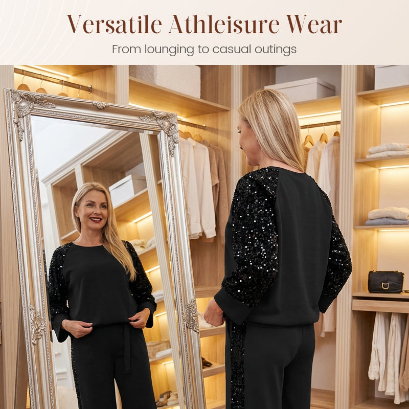 VERSATILE ATHLEISURE STYLE - Seamlessly blend comfort and fashion with this modern athleisure set. The unique combination of casual design and elegant sequins makes it suitable for a wide range of occasions, from casual outings to relaxed social gatherings.